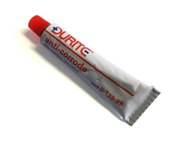 Battery terminal anti-corrosion compound. Kills corrosion and inhibits deterioration of terminals and metal parts on or near lead acid batteries.